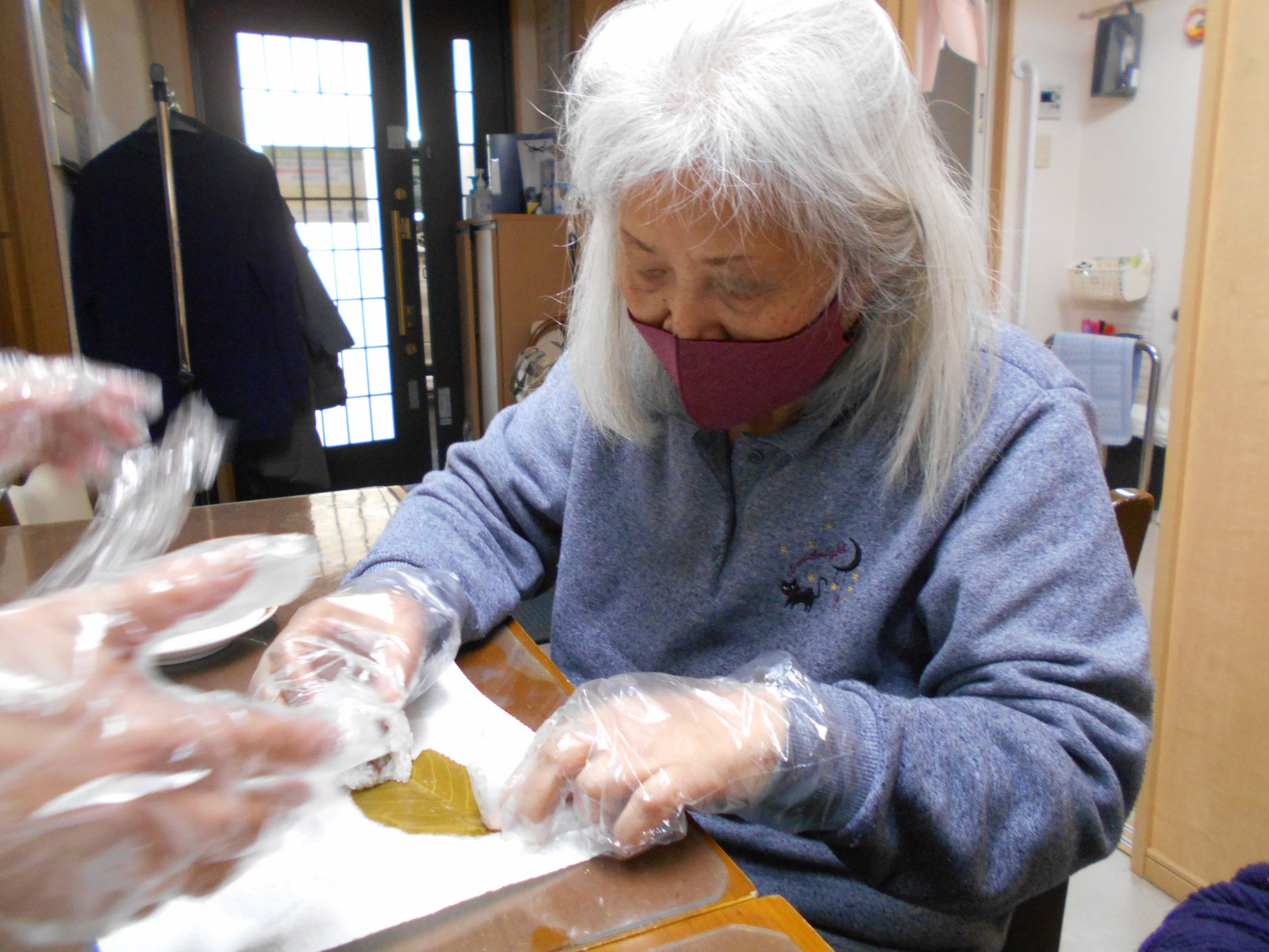 なんと!お二人のご利用者さんがせっかく巻いた桜の葉の塩漬けを取っているではありませんか!!