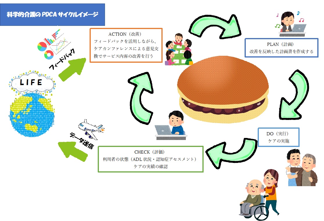 科学的介護というのは令和3年4月から始まったもので、「科学的裏付けに基づく介護」を目指すものです。内容は我々事業所から国(LIFE)へご利用者さんの状態などを報告していきます。そのビッグデータを分析してフィードバックを受け、事業所でのケアに活かしていくというものです。