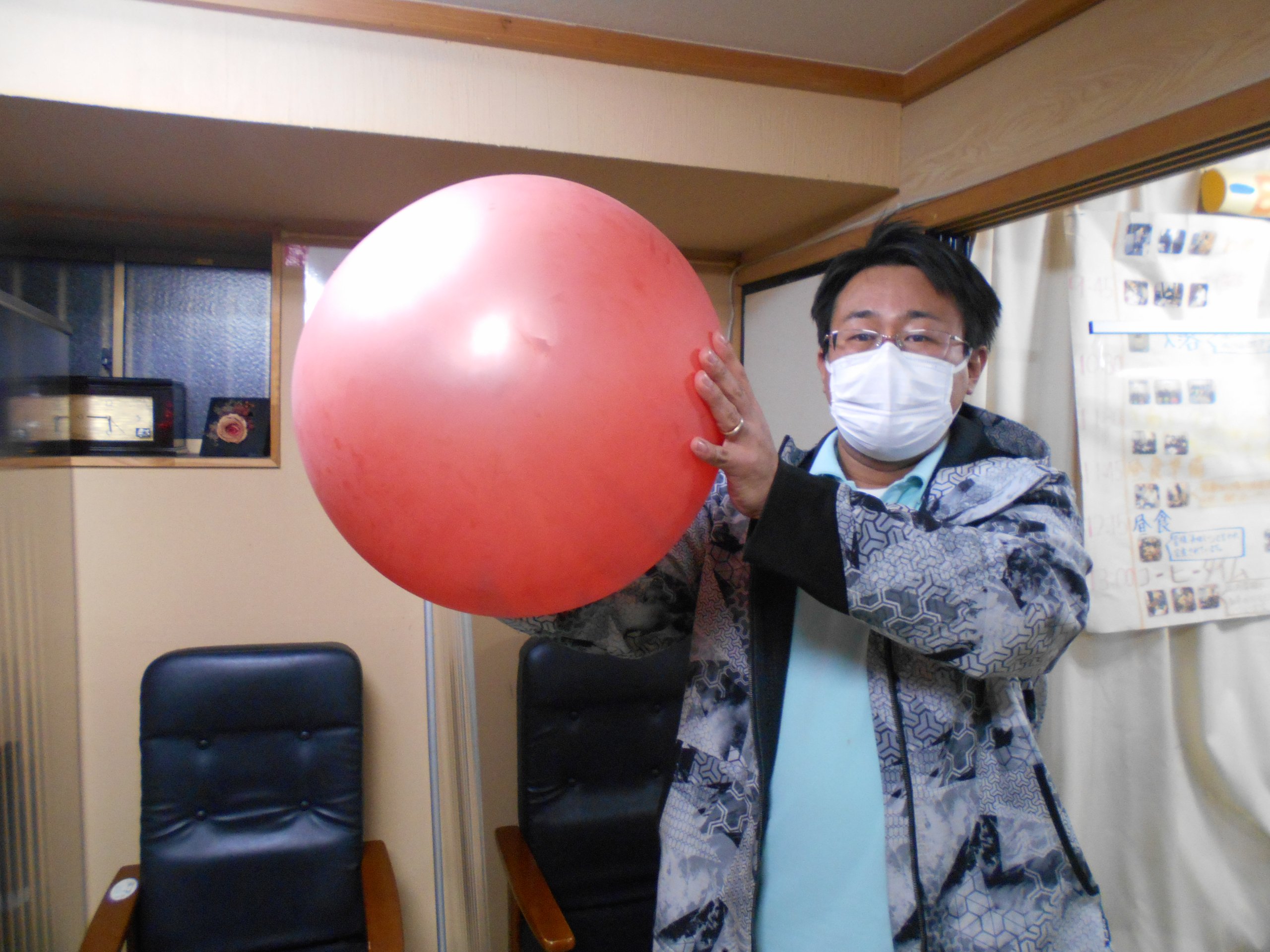 本当はこの風船もっと大きく膨らませられるのですが、ご利用者さん方から大き過ぎると割れた時に怖いとのことでこのサイズに決定しました。