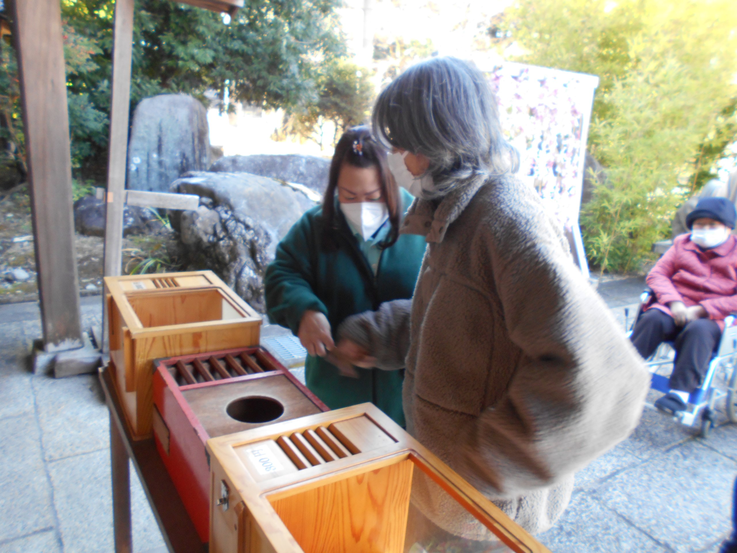 2日間の外出レクリエーションを計画して、1日目は小雪舞う中でしたが寒さよりも「きれいな神社ね」「良いところね」とご利用者さんから楽しんでいただけた声を聞けて良かったです。