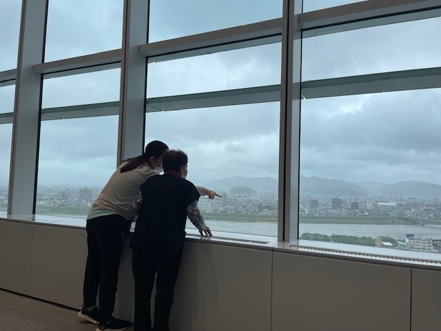 外出レクリエーションとしては曇り空の日もありましたが、「新しくなったんだったね」「来ることがないから見れてよかった」とのお話もありました。岐阜市の中心部という事もあり「この辺は美江寺だね。変わったね」「元々大学病院あったところかぁ」など昔を思い出す会話もあって良かったです。今後も岐阜市ならではのゆかりのある場所へ皆様と共に伺いたいと思っています。