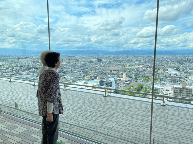 名古屋駅前のビル群も一望できるスケールの大きさに私も正直、感動を覚えました。天気も良く素晴らしい眺めを見ながらご利用者さんと会話ができ良かったです。