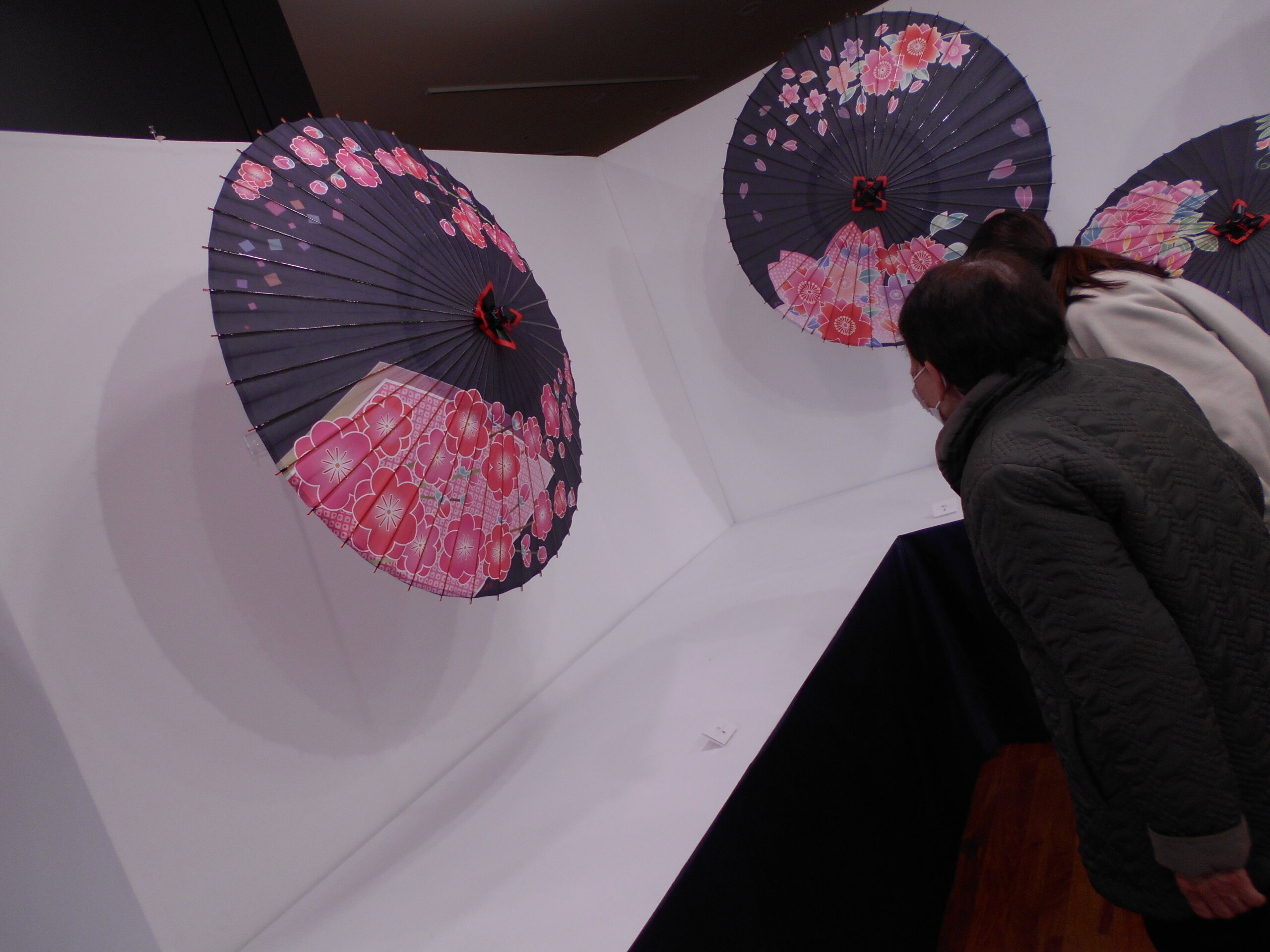 この和傘の展示はたまたま車のラジオで聞き、急いで詳細を調べて計画してくれました。実際にAさんは「素晴らしいですね」と興味津々に一つ一つの作品を笑顔でじっくり見てみえました。