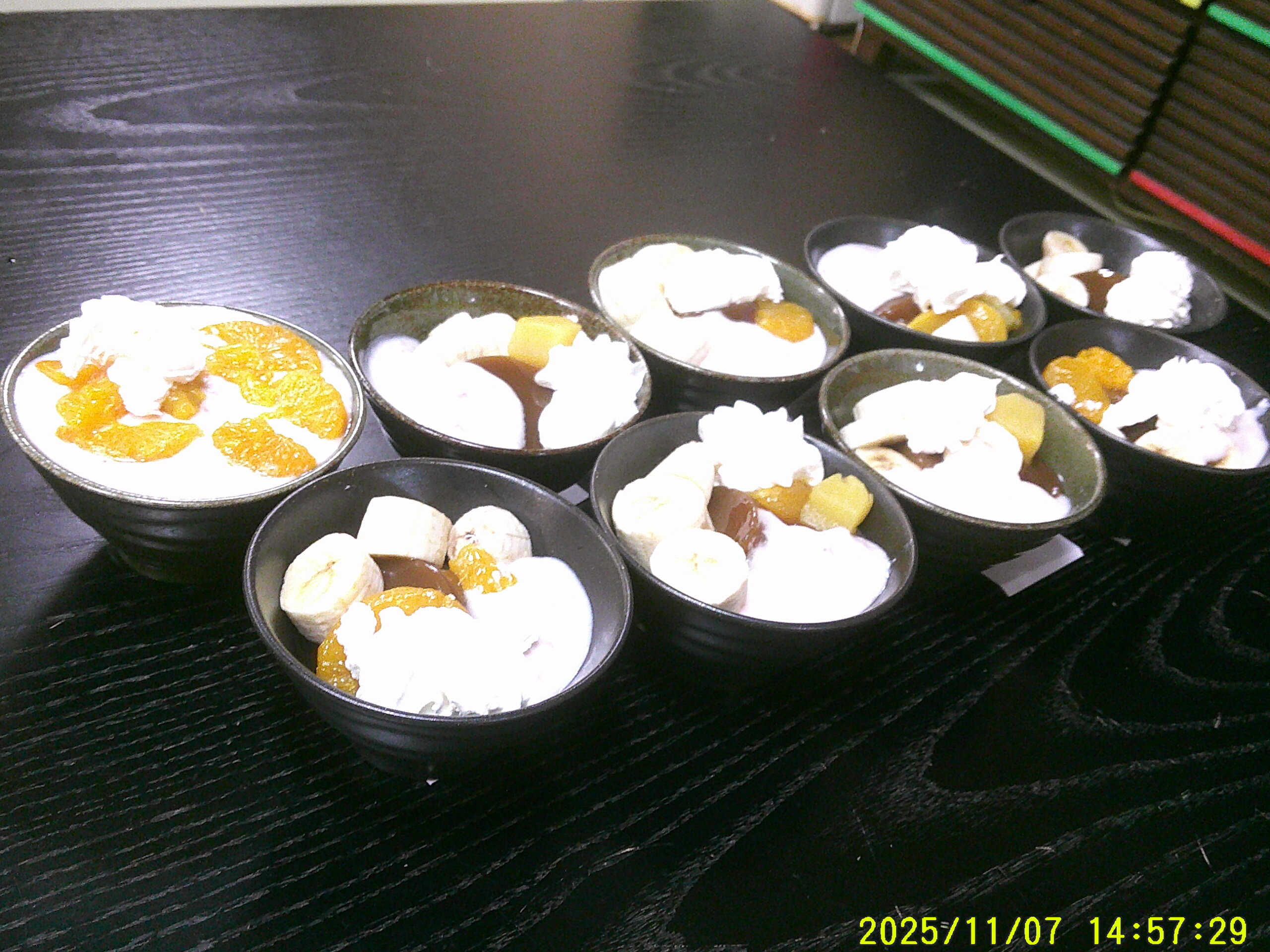今回も果物のカット、盛り付けなどご利用者さんにお手伝いをお願いしました。皆さんの個性が垣間見えるおいしいおやつを作ることができました。🍊🍌🍦