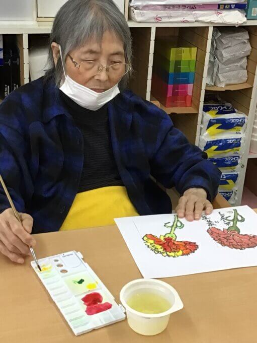 絵手紙は母の日に因んでカーネーション(*´▽`*)お手本は赤色でしたが、いろいろなカーネーションができました。(*^-^*)