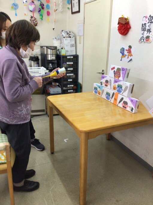 職員が「鬼を倒すよーせーのー」の声掛けに合わせてバーン⚾と勢いよく飛ばして高得点獲得😆😆😆