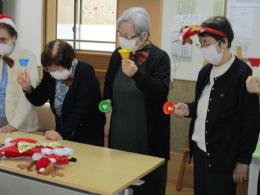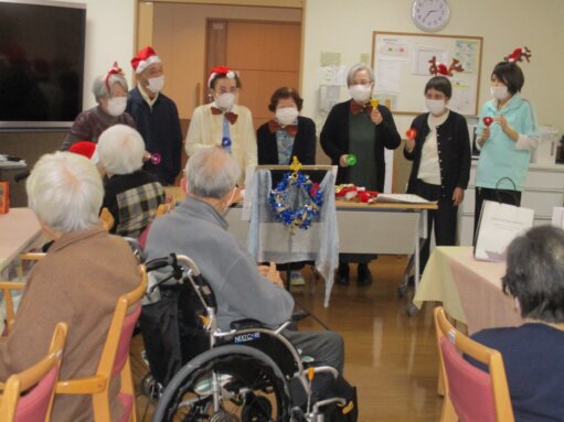 7名入居様が選ばれ一生懸命、力を合わせてハンドベル🔔でクリスマスの歌を2曲演奏しました。