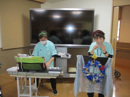 次に職員でエレクトーン🎹とオカリナ演奏🪈して皆さんと一緒にクリスマスの歌を合唱しました。