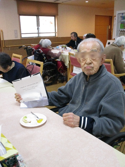 今度はくじ引きを引いてクリスマスプレゼントをもらいます。”何が入っているのか楽しみ!””ワァこんなのが欲しかったの良かったわ!”など声が飛び交います。中身を見ては喜んでもらえました。
