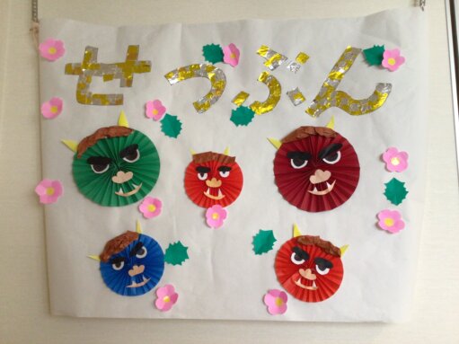 せつぶんと書いた字に金色と銀色の折り紙をちぎり、丁寧に色の配置を考えられぺたぺたと貼ってもらいました😊