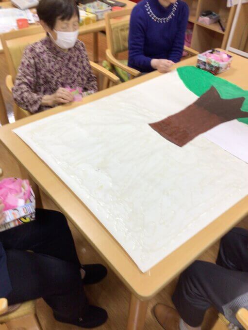 画用紙に職員が木の根っこを書き、みなさんに絵具を使って塗ってもらいました🌳