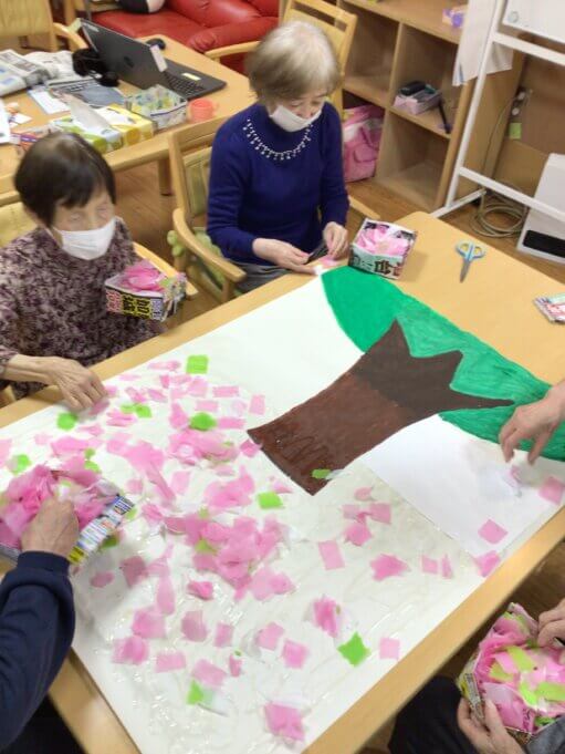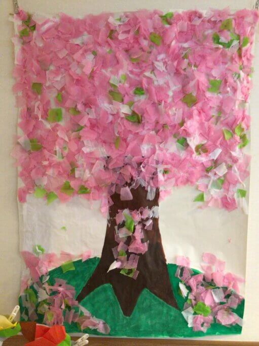 桜の花を咲かせるために、ピンク色のはな紙をちぎってもらい、