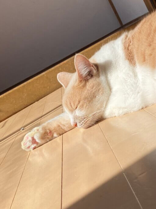 実は、私の家には猫が2匹いまして、そのうちの一匹が日向ぼっこ中ウトウトしてて、かわいさのあまり写真撮ってしまいました。