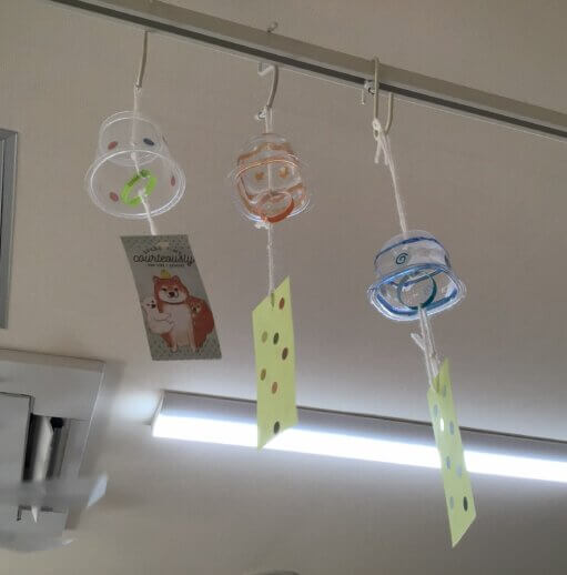 あえて音のならないバージョンで、利用者の方がマジックやシールで各々デザインし、なかなか可愛らしい風鈴が出来上がりましたよ(*^^)v