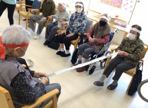 細長く繋げた新聞の端と端を持ち、引っ張りあいます。切れた位置によって勝敗が決まります。切れ端が長い方が勝ち。どこで切れるか分からず、力の入れ加減が勝敗を分けます。
