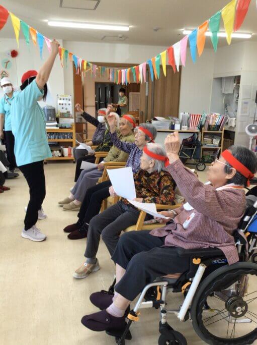 ♪もしもし、カメよカメさんよ~♪の曲を替え歌にし、赤団・白団で分かれて大きな声で応援合戦をしました。一番声を張っていたのは、応援リーダーのスタッフでした(^O^)/