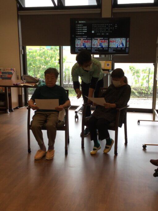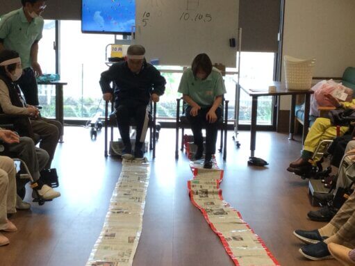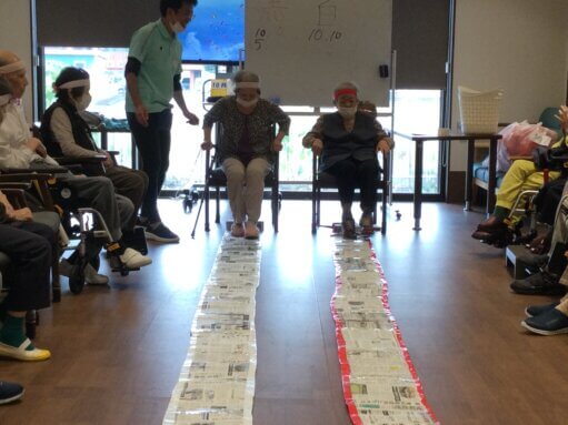また、ご利用者さんの身体に合わせて本来の長さの半分にしたり、スタッフVS利用者となった場合にはスタッフには複数のハンデを付けたり等、工夫しながら行いました。(新聞紙は靴下を履いた足では年齢関係無く、中々引っ張れないんですね笑)