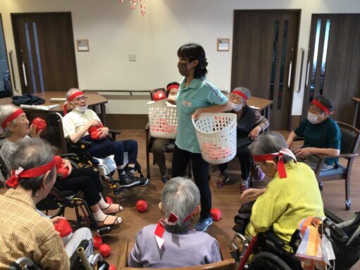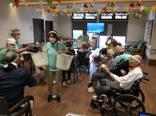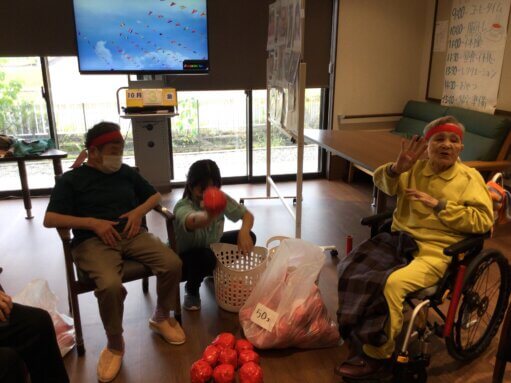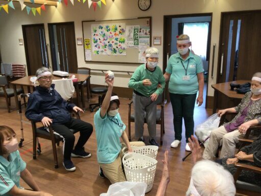 最初の競技は玉入れです。玉入れでは、全員参加でカゴを持つスタッフを中心に輪になってカゴめがけて投げました。カゴを持つスタッフはその場で回転しており、ご利用者さんは玉がなかなか入らず苦労していました。カゴを持つスタッフも常に回転している為、とても大変そうにしていました...笑。