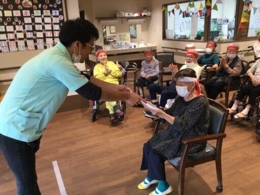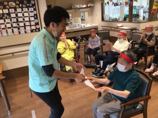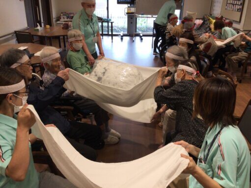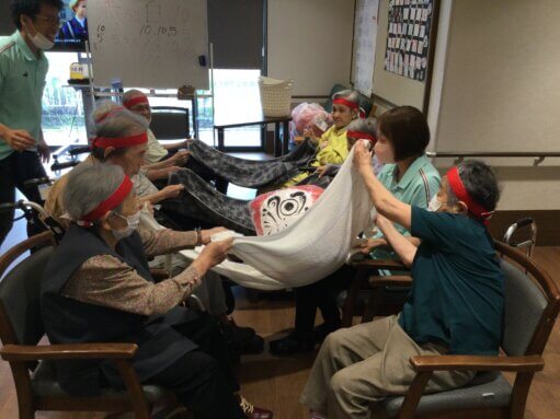 最後の種目はだるま渡しです。2人1組でバスタオルを広げて、隣の方にだるまを受け渡していきます。受け渡しが難しいご利用者さんにはスタッフが補助に入り行いました。参加者はだるまを渡す時に落とさないよう慎重に行う為、中々渡せず苦戦を強いられました。