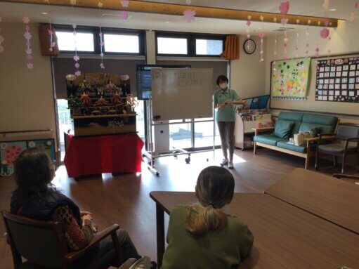 ひな祭りの歌を唄いながらリハビリ体操を行いました。歌いながら体を動かし、脳トレ効果絶大です☆