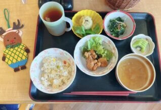 昼食:ピラフ、唐揚げのあんからめ、さつまいもサラダ、ほうれん草のソテー、コンソメスープ、フルーツ