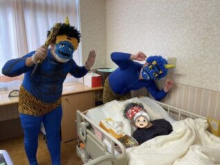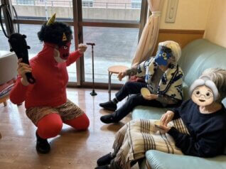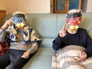 付けているこの鬼のお面は、ご利用者さんがちぎり絵で手作りしたものです👹💕楽しみながら身体を動かす事ができ、喜んでいただくことができたようです👏