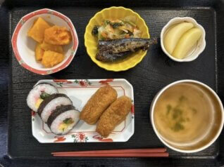 昼食は、カットされていますが恵方巻きを提供させていただきました。2023年の方角は「南南東やや南」でした👍豆まきをして、恵方巻きを食べて今年も元気いっぱいに(●^o^●)!