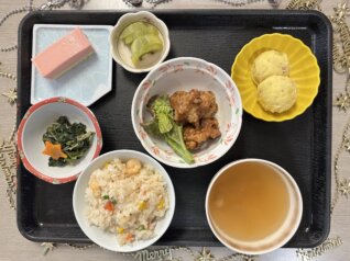 昼食は、クリスマスメニュー💓15時のおやつは、ストロベリームースケーキ・三色プリンでした(食事形態に合わせて提供しています。)ご利用者さんは「ピラフも、から揚げも美味しい!」と喜ばれ召し上がられていました😊