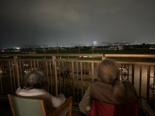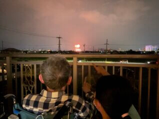 夕食後ご利用者さんにお声掛けをし、ご希望の方には北の町、南の町のベランダや、食堂ホールから花火を見ていただきました。