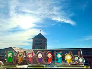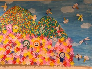 ナーシングケア寺田の3階エレベーターホールに飾っている壁画にもなごみちゃんとひかるちゃんと一緒にタヨウセイのみんなが遊びに来てくれています*.(*´͈ ˘ `͈*).*