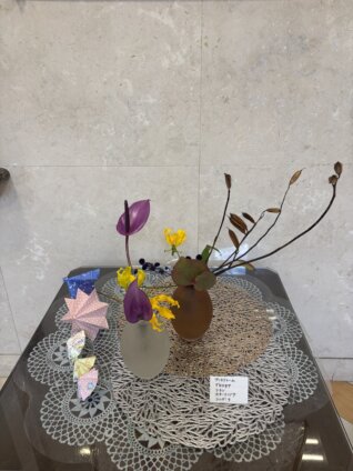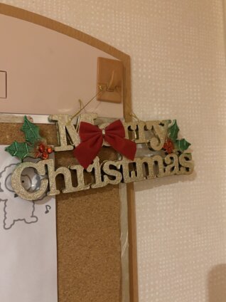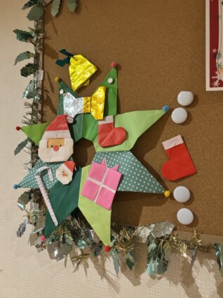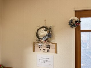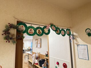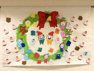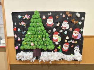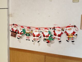↑こちらは3階のエレベーターホールに飾ってある壁画になります。スタッフが描いたリースに、ご利用者さんと折り紙で作った雪だるまや顔を描いて頂いたサンタクロースを飾りました🎅