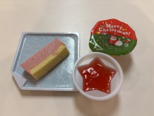 おやつには、食事形態に合わせてストロベリームースケーキと3色プリンを提供させて頂き1日を通してクリスマスのメニューを楽しんで頂きました。