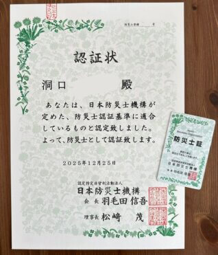 防災士の勉強を通して感じたのは、防災は「特別な知識」ではなく、日々の備えや考え方の積み重ねだということです。「もしもの時にどう動くか」「何を優先するか」を知っておくことの大切さを改めて実感しました。