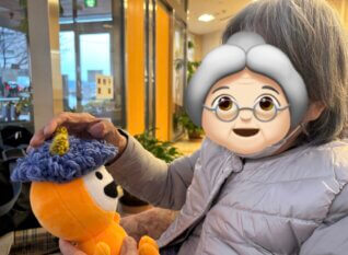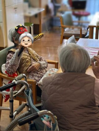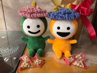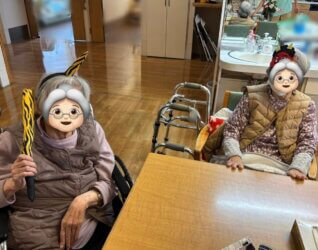 一階エントランスには鬼の帽子を被ったなごみちゃんとひかるちゃんがいました!スタッフの手作りの帽子です!🧶🧢