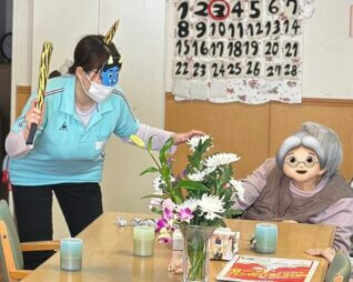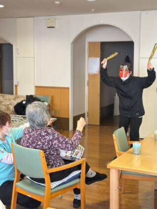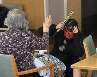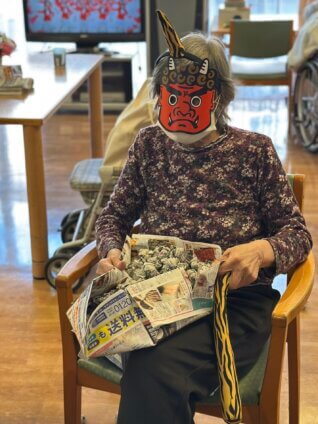 ナーシングケア寺田では、鬼が現れたのでご利用者さんに豆撒きをして頂きました!