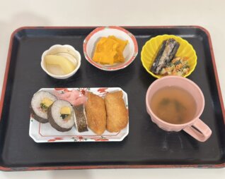 昼食は太巻きと稲荷寿司、いわしの甘露煮、南瓜の煮付け、吸い物、果物