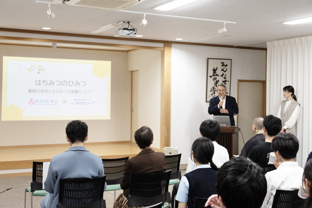 トークには、株式会社秋田屋本店 代表取締役会長 中村源次郎氏と和光会職員も登壇し、「はちみつのひみつ ~養蜂の苦労と蜂蜜の栄養について~」をテーマにお話ししました。