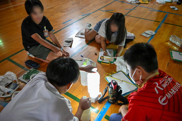 水やスポーツドリンク、サラダ油、牛乳、麦茶、小麦粉を入れたペットボトルを用意し、懐中電灯で下から照らし、どの液体が一番明るく見えるのかを観察しました。子どもたちの反応は満場一致で「スポーツドリンクが一番明るい!」という結果に。しかし「牛乳のやさしい光もいいね」「水のきらめきは避難所で見たら癒されるかも」といった素直な発見も見られました。