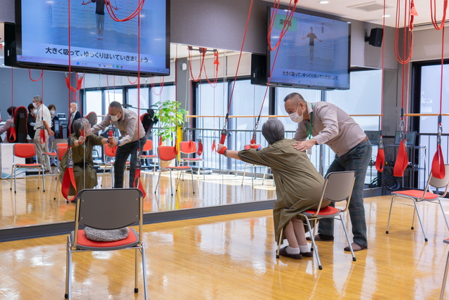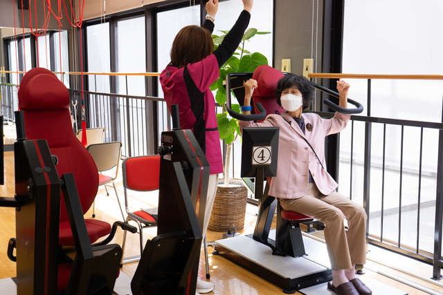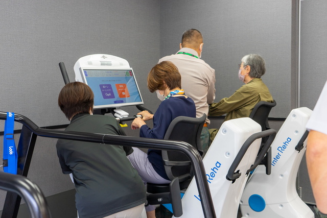 式典後には、ご来賓の方々が施設内を見学され、各種リハビリマシンの体験も行われました。新しい設備や取り組みに触れていただくことで、施設の特色を知っていただく良い機会となりました。