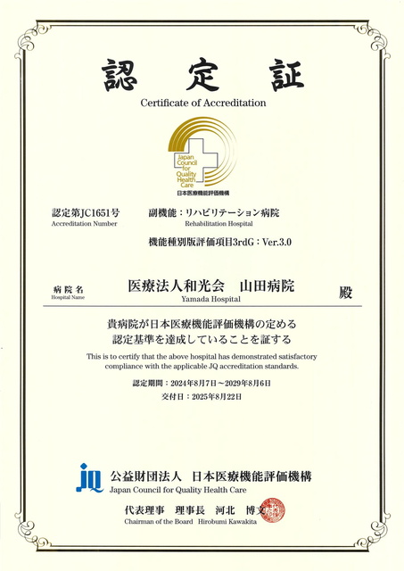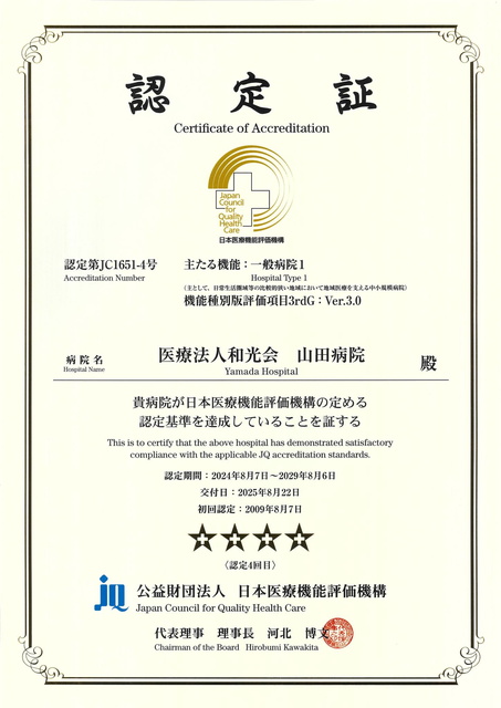 医療法人和光会 山田病院は、公益財団法人日本医療機能評価機構による「病院機能評価」の更新審査を今年2月に受け、このたび認定証が届き、更新が完了いたしました。