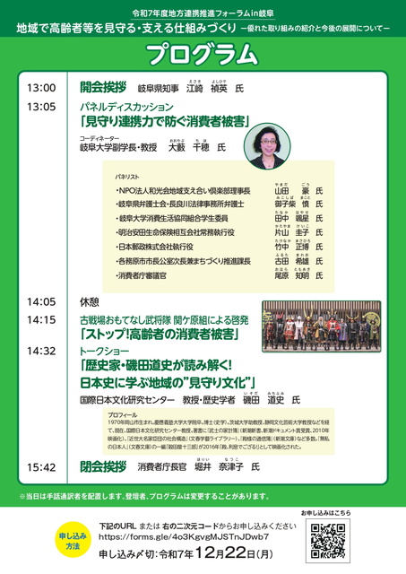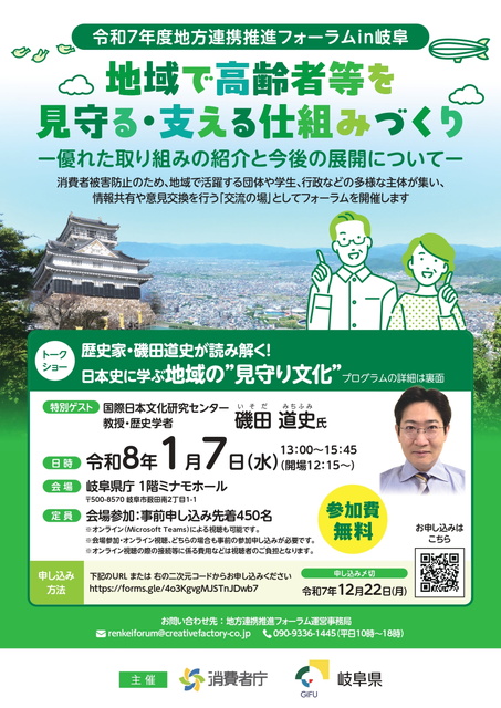 本フォーラムは、地域の消費者問題に携わる消費者団体や行政、関係機関など多様な主体が連携・協働し、消費者被害の防止に向けた取り組みを進めることを目的に、消費者庁と岐阜県の共催により開催されたものです。