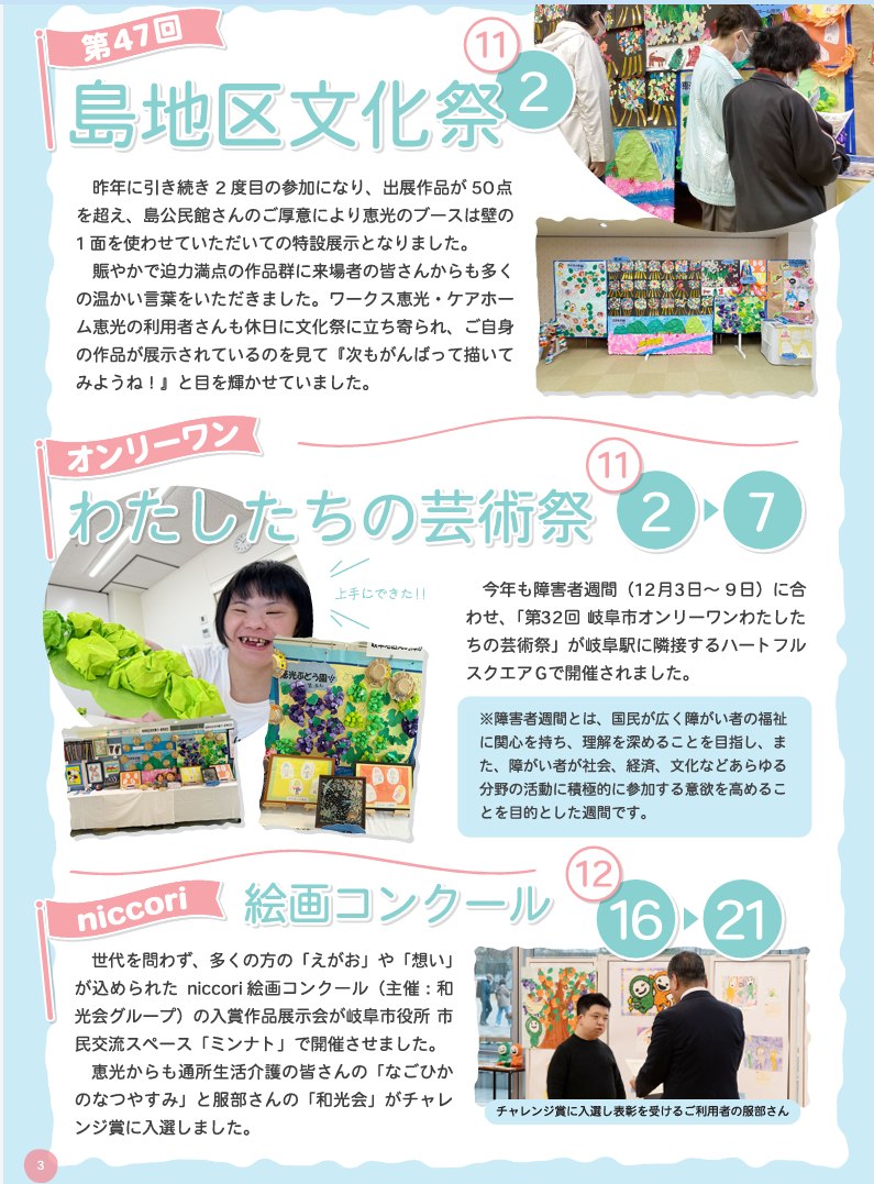 今号では、新施設長のご挨拶をはじめ「恵光音楽文化祭」の様子や、地域の文化祭・芸術祭への参加、絵画コンクール入賞など、ご利用者の活動や成果を幅広く紹介しています。