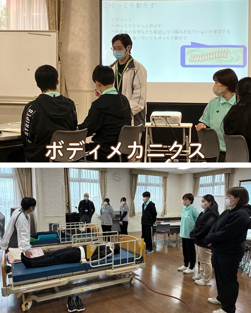 1週目は、社会人・専門職としての基礎を学ぶとともに、介護技術の基本やボディメカニクスについて学習しました。